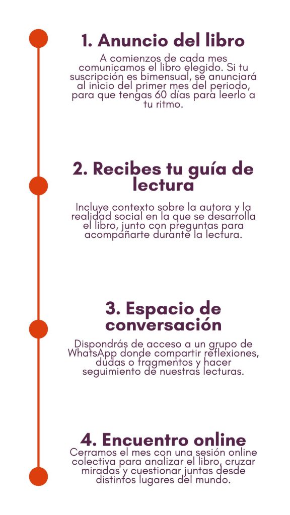 Desde Mujeres de la Luna buscamos ofrecer una experiencia de lectura compartida que trascienda la dinámica individual y transforme el acto de leer en un proceso colectivo y crítico. En este club de lectura elegiremos obras que fomenten la reflexión, amplíen nuestras perspectivas y nos permitan acercarnos a realidades diversas. Queremos generar un espacio donde los libros no solo sean leídos, sino debatidos, cuestionados y sentidos “entre amigas”.